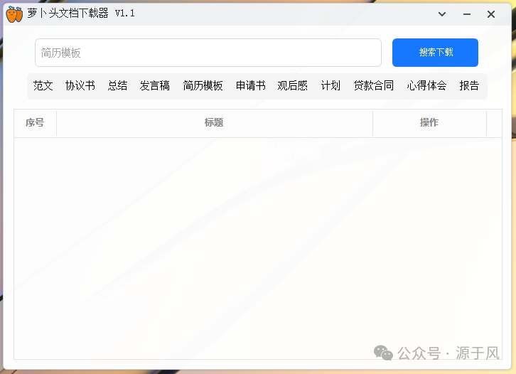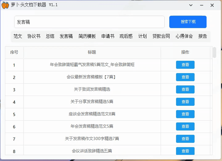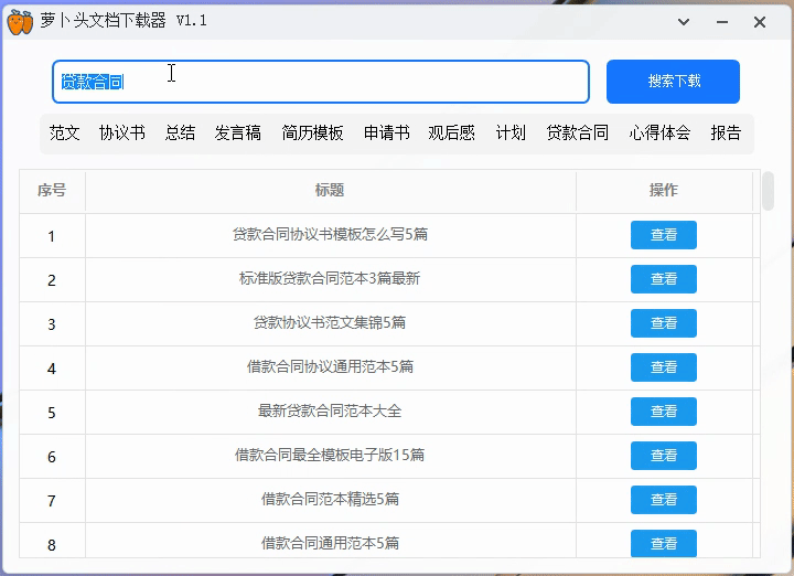是一款免费实用的文档下载器,全网很多资料都能搜索到,包含但不限于:范文、协议书、总结、发言稿、简历模板、申请书、观看感、计划、贷款合同、心得体会、报告。