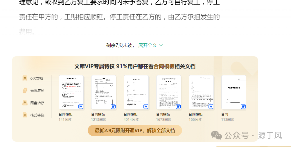 我们经常在网上搜文库的时候,资料只能看一半,剩下的就要充会员才能解锁,导致每次搜到的资料都用不了,就像下面一样。