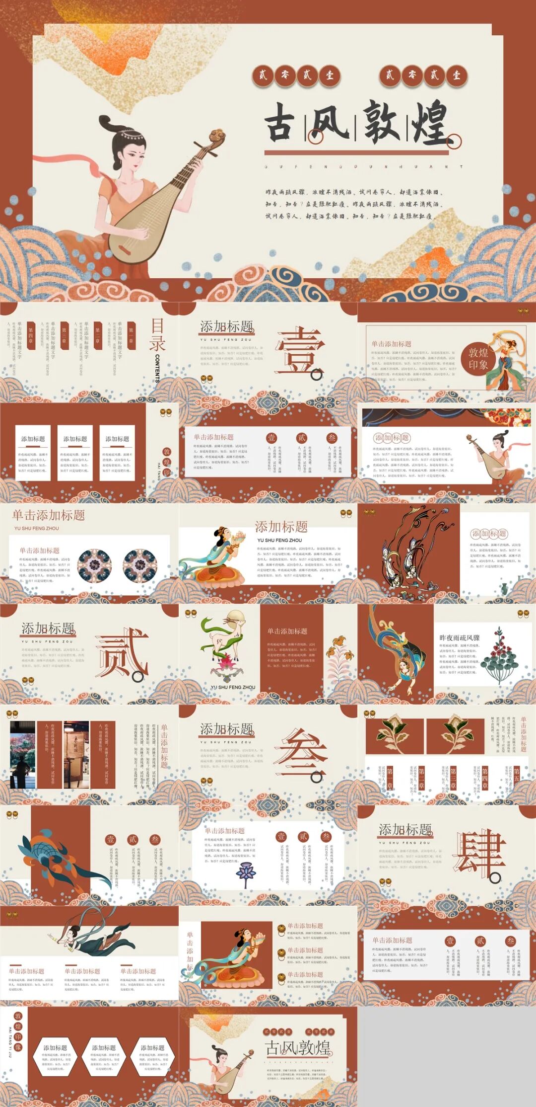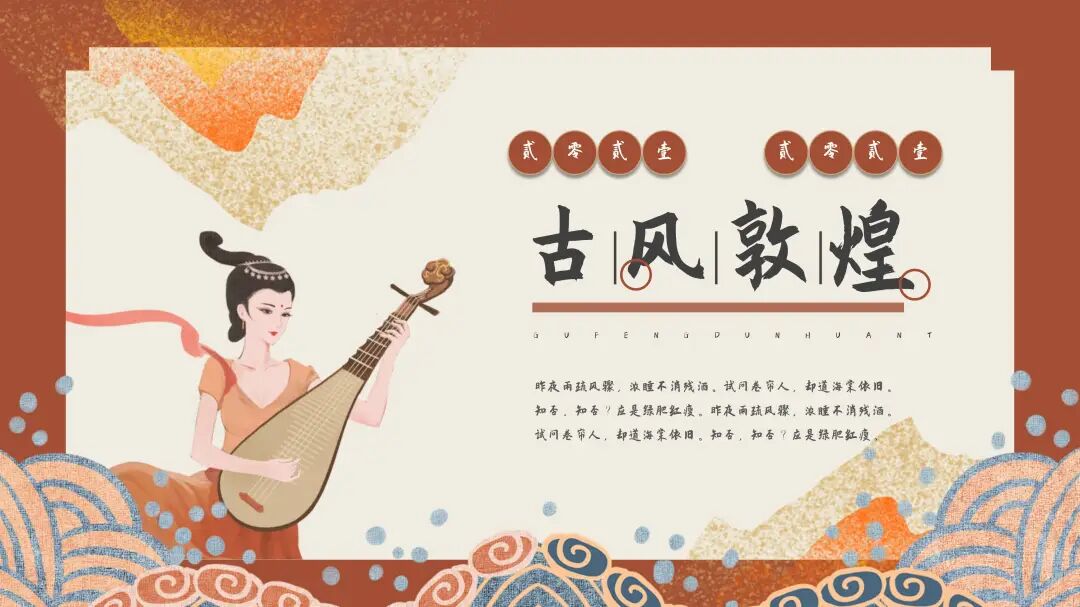 敦煌,这座古老而神秘的城市,作为中国古代丝绸之路上的重要节点,承载了深厚的历史与文化。敦煌壁画、石刻、雕塑等艺术品,都是中西文化交流的珍贵遗产,具有独特的艺术魅力和深厚的文化内涵。将敦煌元素巧妙地融入PPT设计中,不仅让PPT增添了丰富的文化底蕴,更使整体设计散发出一种独特的艺术韵味。