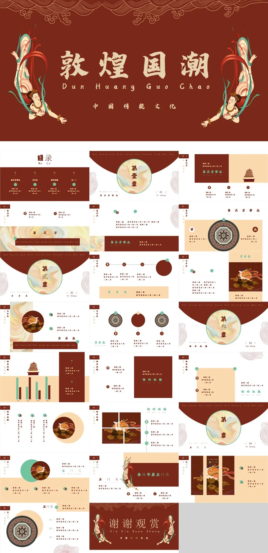 敦煌艺术以其独特的色彩、线条和图案闻名于世。鲜艳的色彩、流畅的线条、富有象征意义的图案,都成为了敦煌艺术的标志。在敦煌国潮风PPT设计中,这些独特的视觉元素被充分运用,使得整个PPT呈现出一种别具一格的视觉美感。同时,这些元素也传递了敦煌文化的精髓,让人在欣赏美的同时,也能感受到敦煌文化的博大精深。